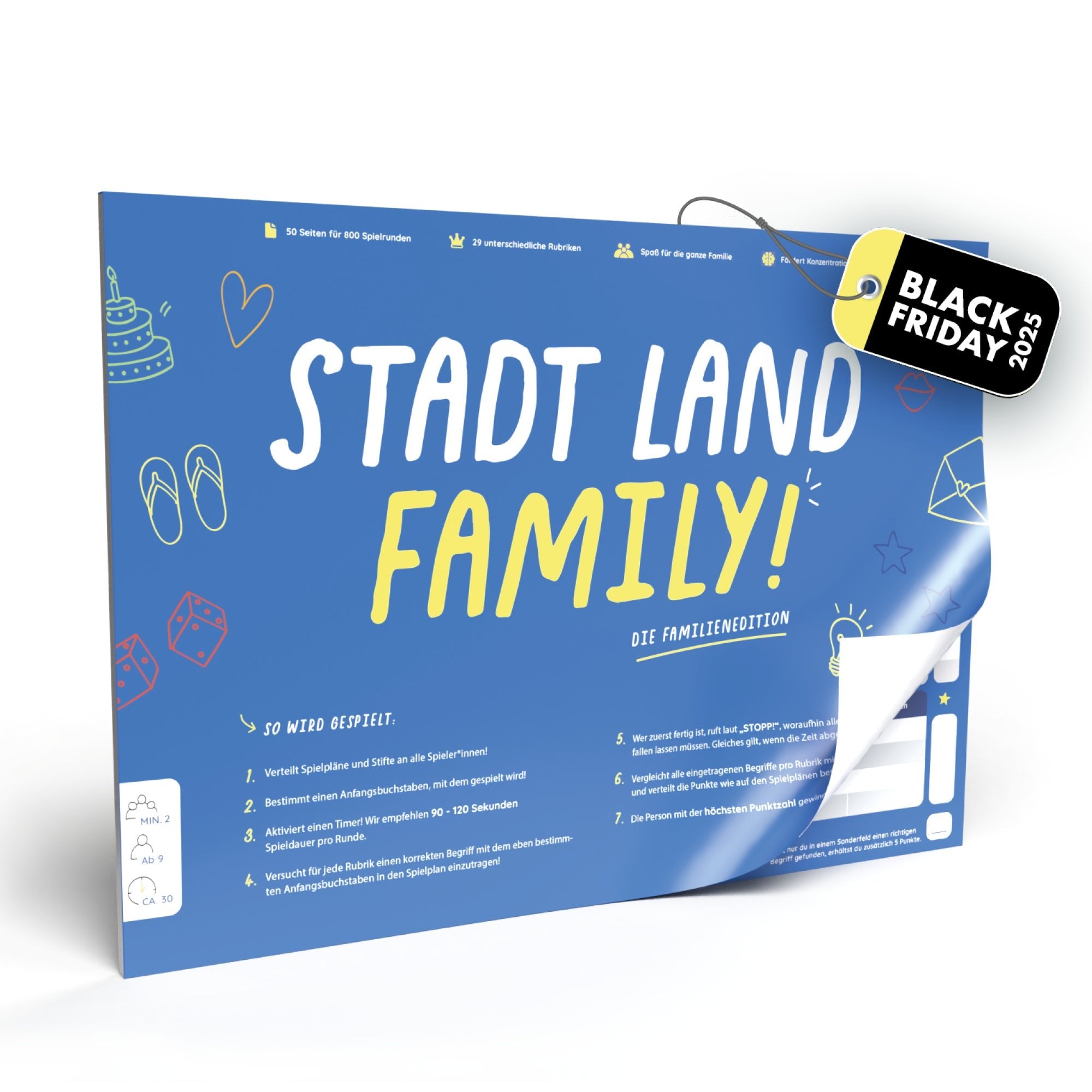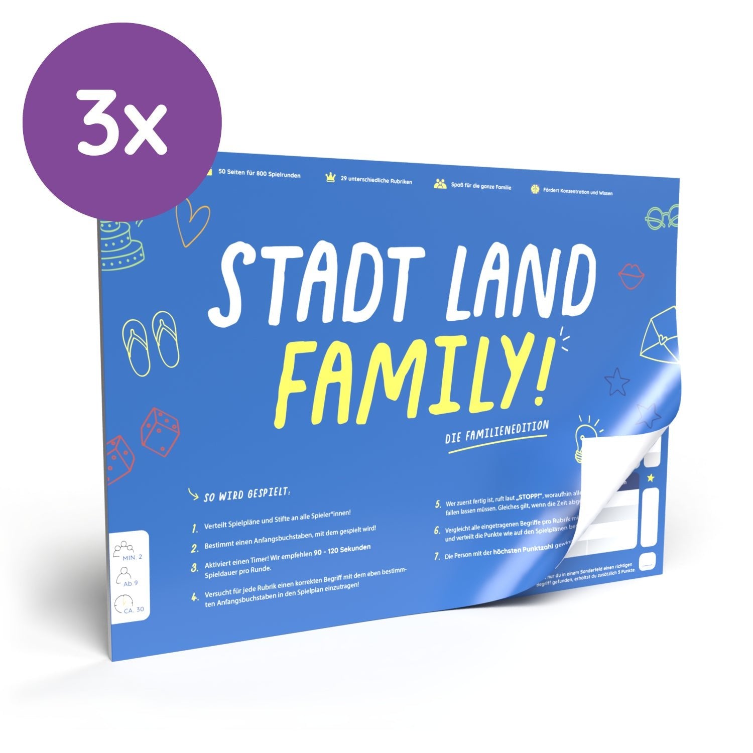 In "Stadt Land Family" dreht sich alles um das Erkunden und gemeinsame Erleben von außergewöhnlichen Kategorien, die weit über die traditionellen Themen wie Länder, Städte und Flüsse hinausgehen. Freut euch auf spannende und humorvolle Kategorien wie Superhelden, Lieblingsspeisen, Urlaubserinnerungen und vieles mehr. Diese besonderen Themen regen die Fantasie an und bieten eine unterhaltsame Möglichkeit, miteinander ins Gespräch zu kommen und Neues über eure Lieben zu erfahren.