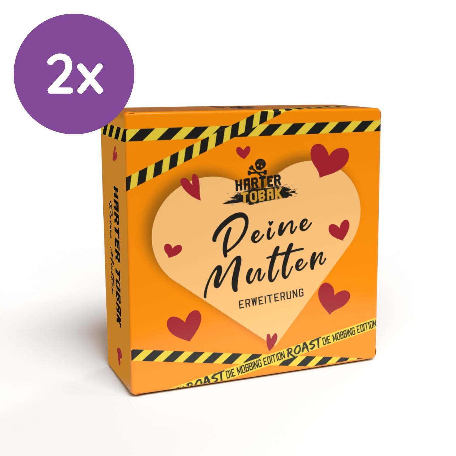 Ergänzend zu den 500 Karten von Harter Tobak Roast, erhaltet ihr mit der Deine Mutter-Erweiterung 35 Lückenfüller und 45 Lückentexte, die sich alle um Mama drehen.